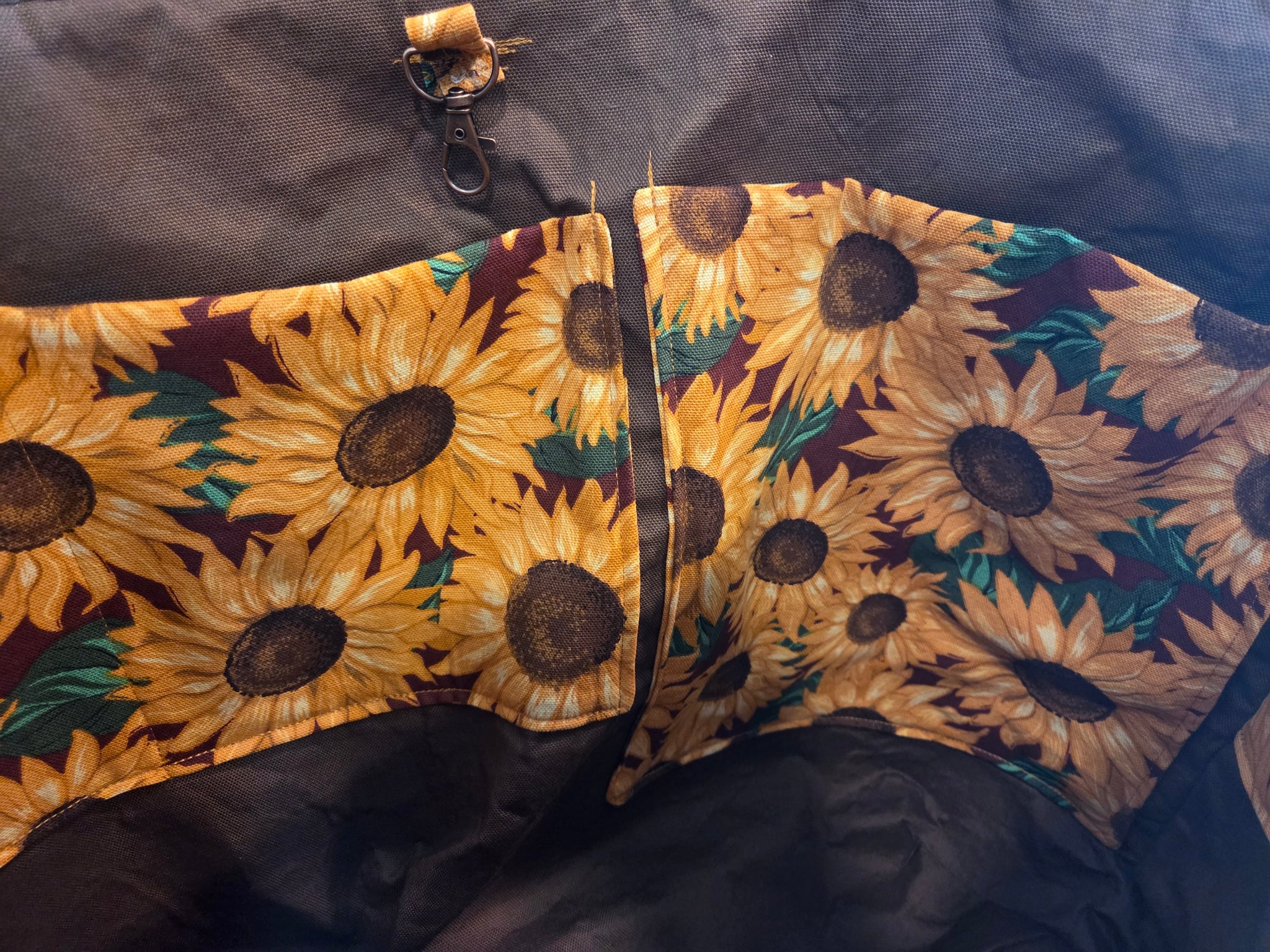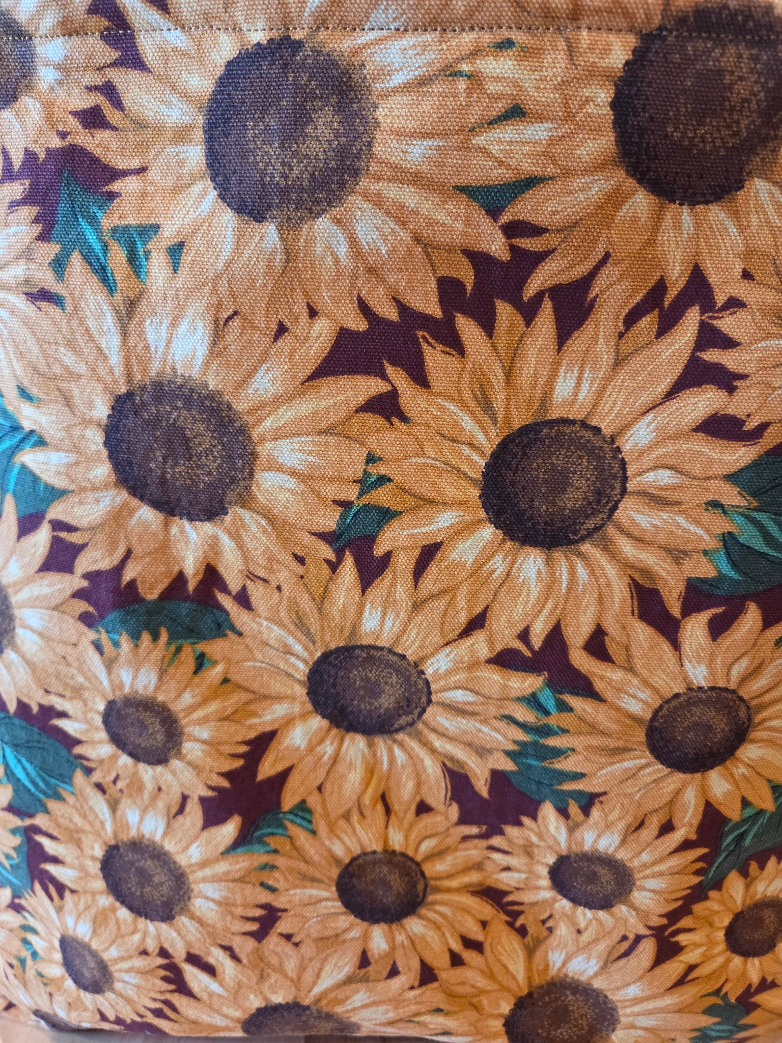 Medium Tote bag very durable made of canvas and Duc cloth. Machine was and dry. Measures 6 inches wide, 16 inches long, 13 inches tall. Inside lined with pockets, including large pocket that fits an I pad including a cover or a book.