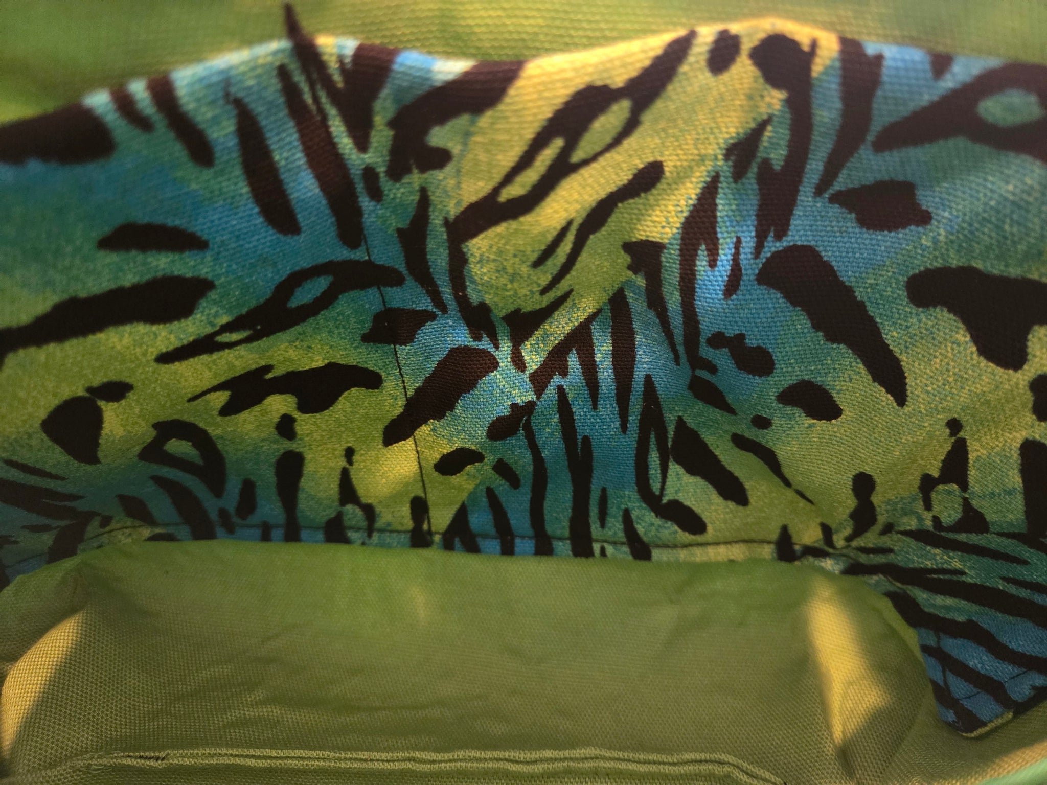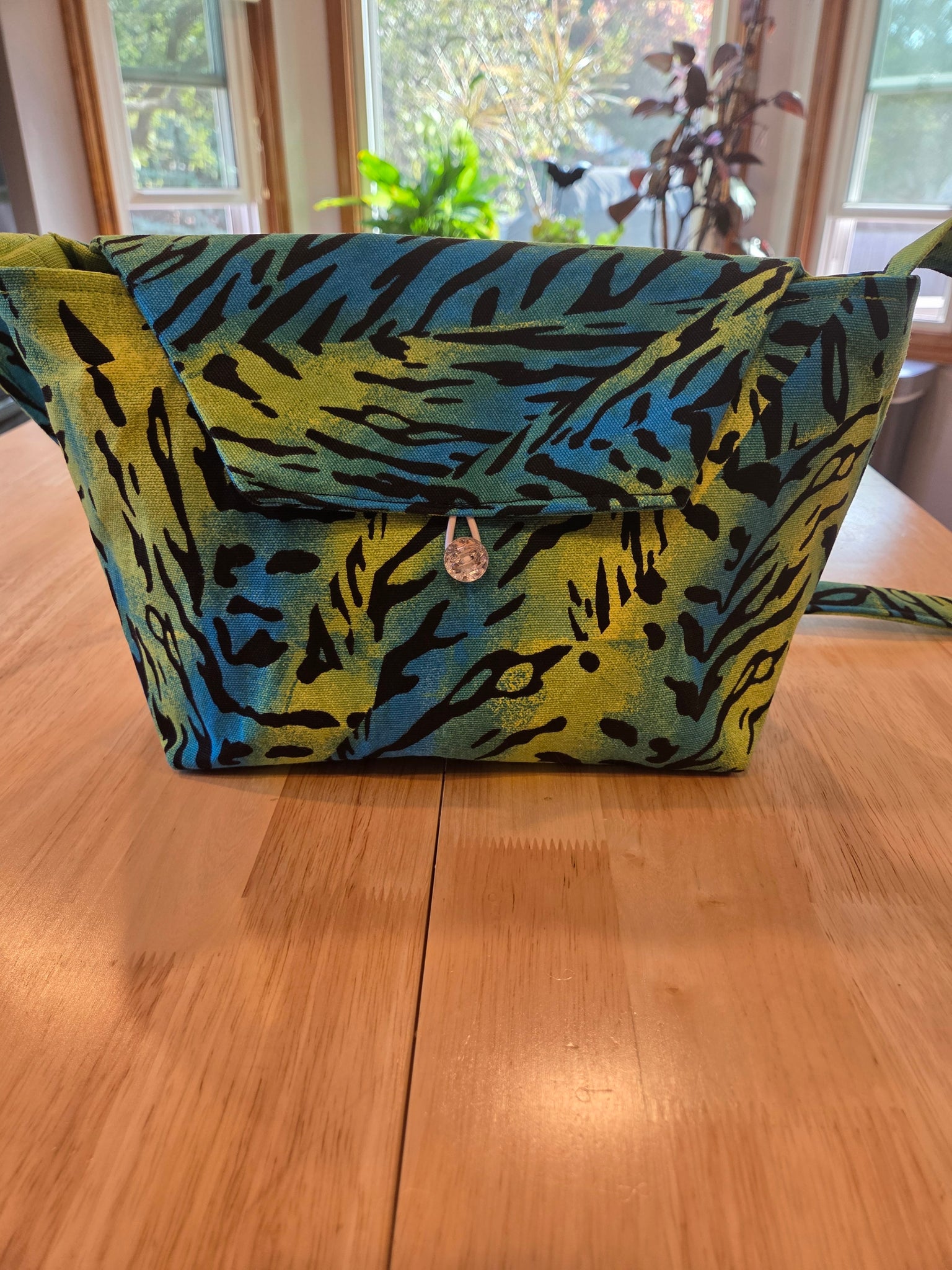 Animal print purse with cross body strap.  Lined with pockets, machine wash and dry.